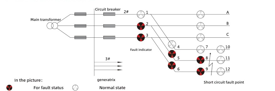 بناءً على خصائص أعطال الدائرة القصيرة، فإن معيار العمل هو التغيير المفاجئ في التيار المصحوب بانقطاع التيار الكهربائي لجهاز الحماية. منطق التفسير لمخطط إشارة الخطأ هو كما يلي: إذا كانت المؤشرات 2 و5 و8 للمرحلة A والمؤشرات 3 و6 و9 للمرحلة C للخط 2 كلها تتحول إلى اللون الأحمر، بينما تظل المؤشرات 11 و12 بيضاء، فيمكن تحديد حدوث خطأ في دائرة قصر عند نقطة الخط الخارجة تلك.